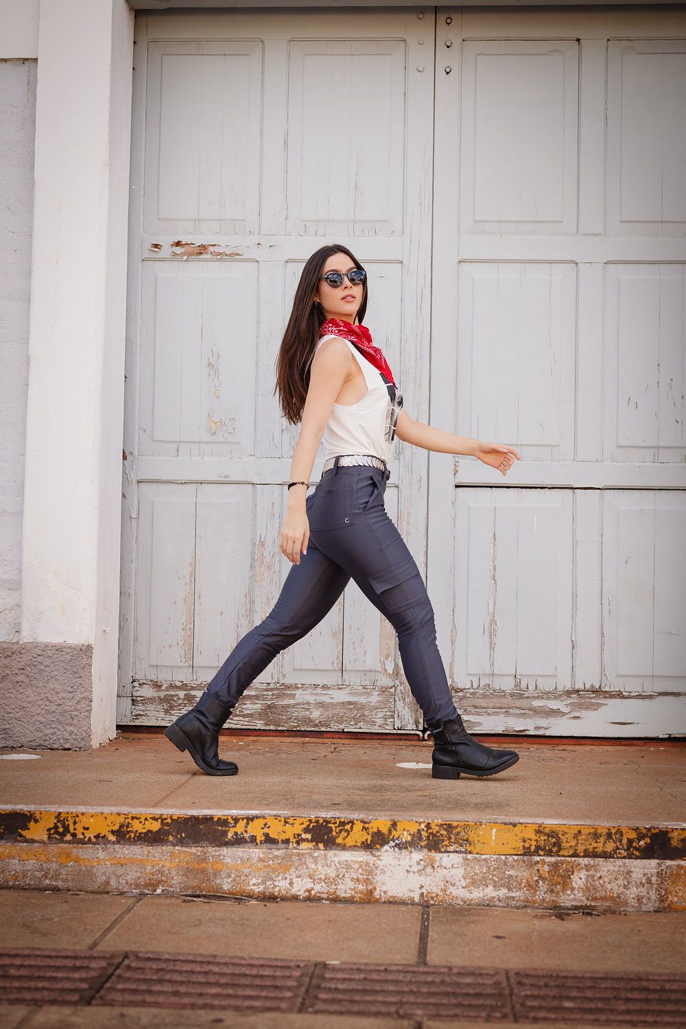 Tecido Prada encorpado com design exclusivo que une dois estilos, Jogger e Cargo, oferece estilo e conforto para a pilotagem.
