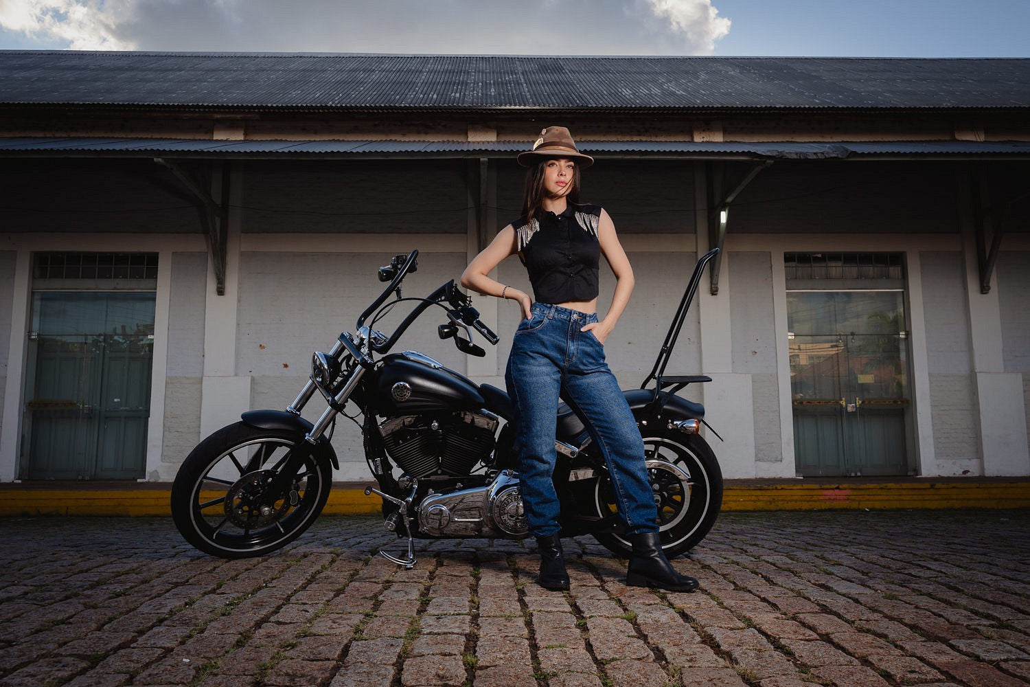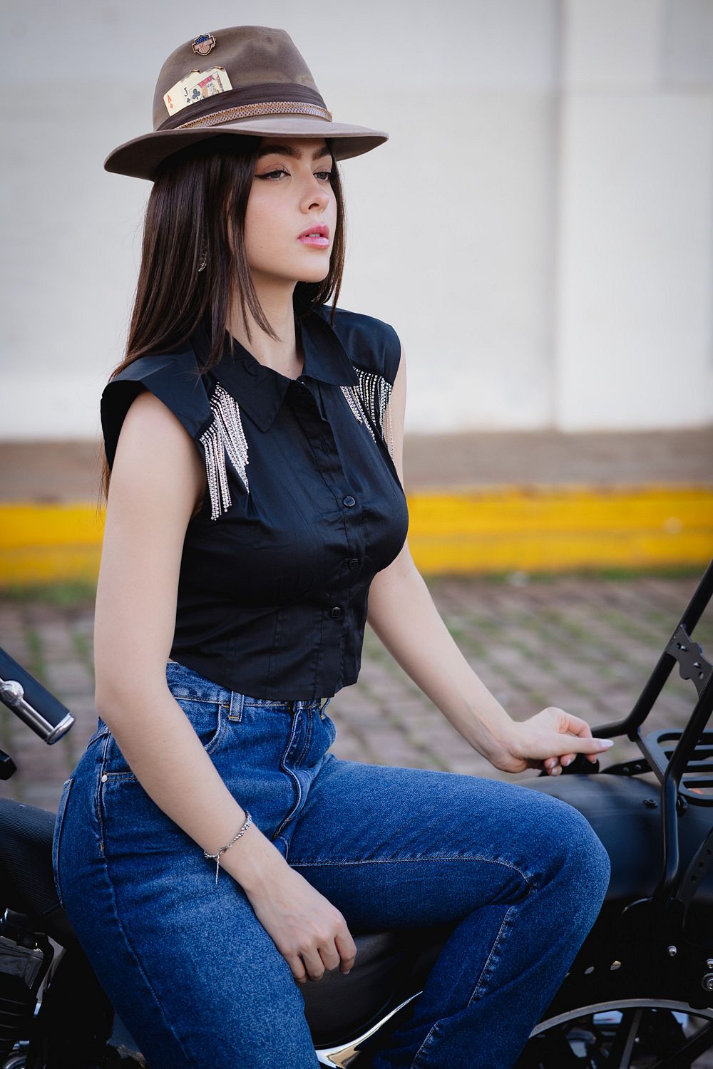 A customização exclusiva Celeiro Biker's, adiciona valor à peça com franjas de strass na medida certa! Você será o rolê.