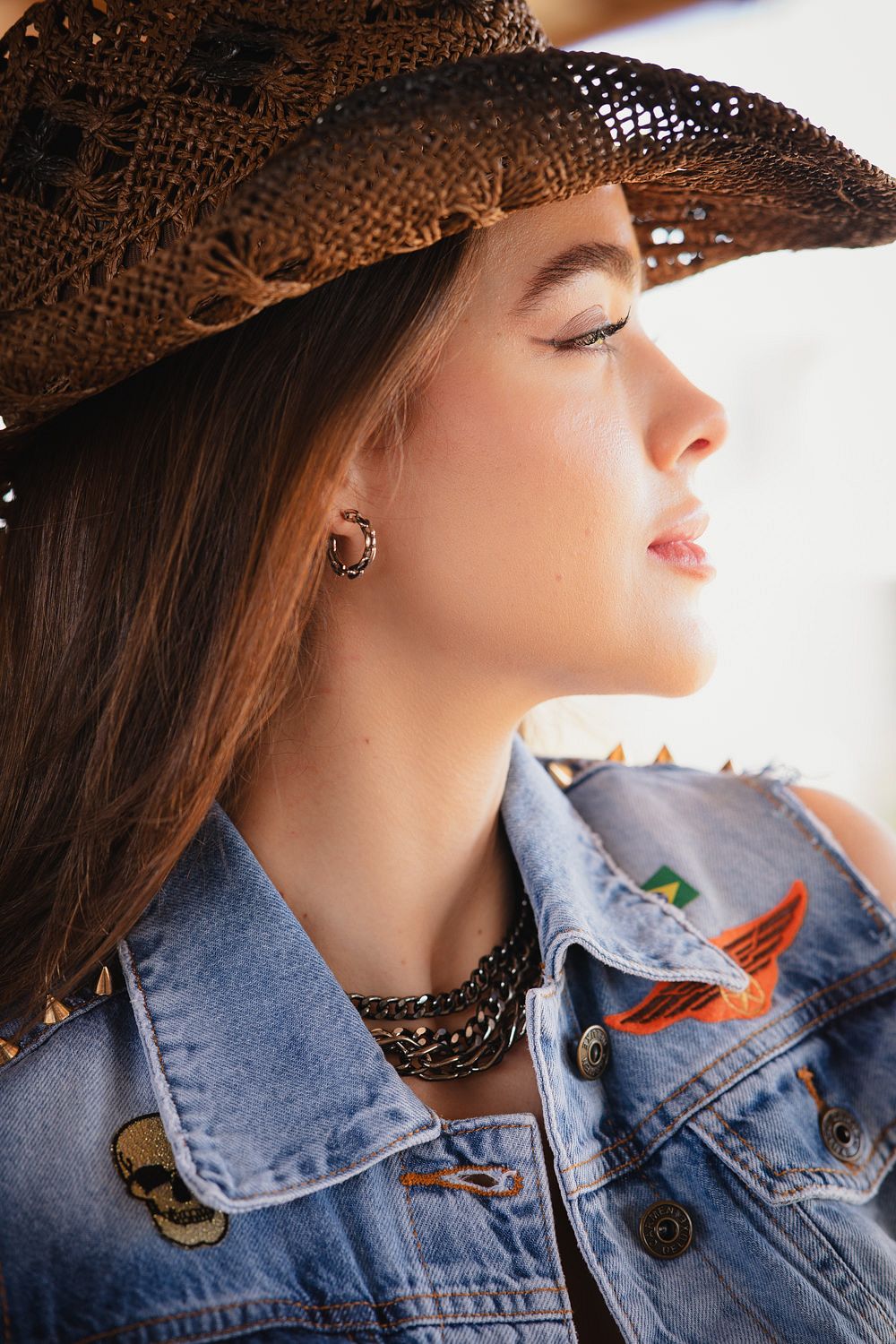 Colete jeans Destroid com customização exclusiva Celeiro: patchs, spikes e apliques.