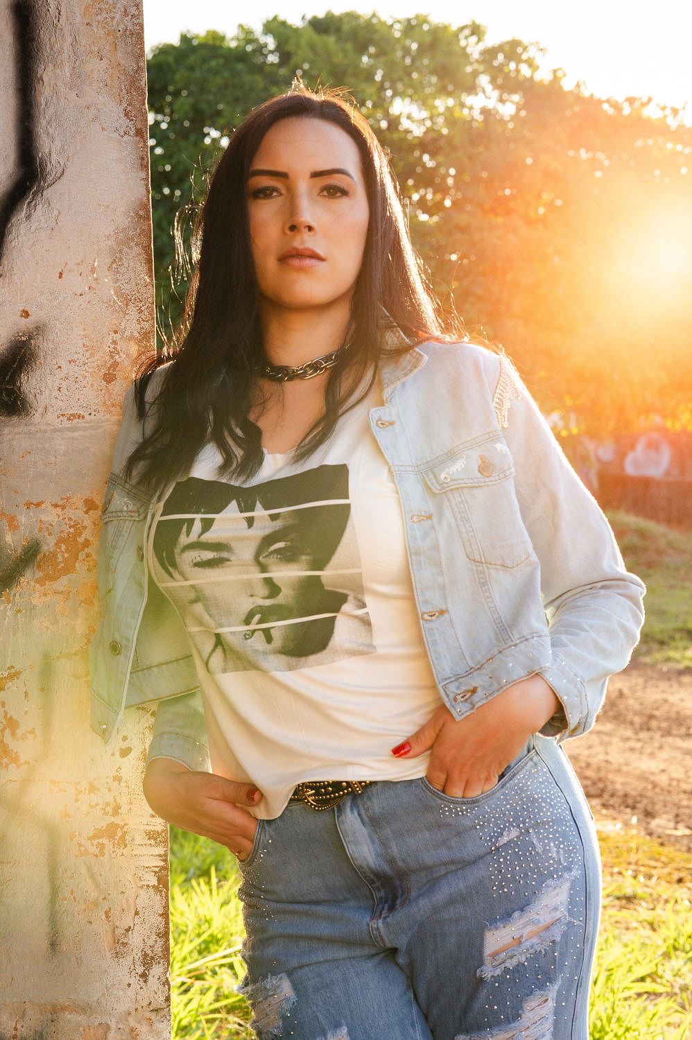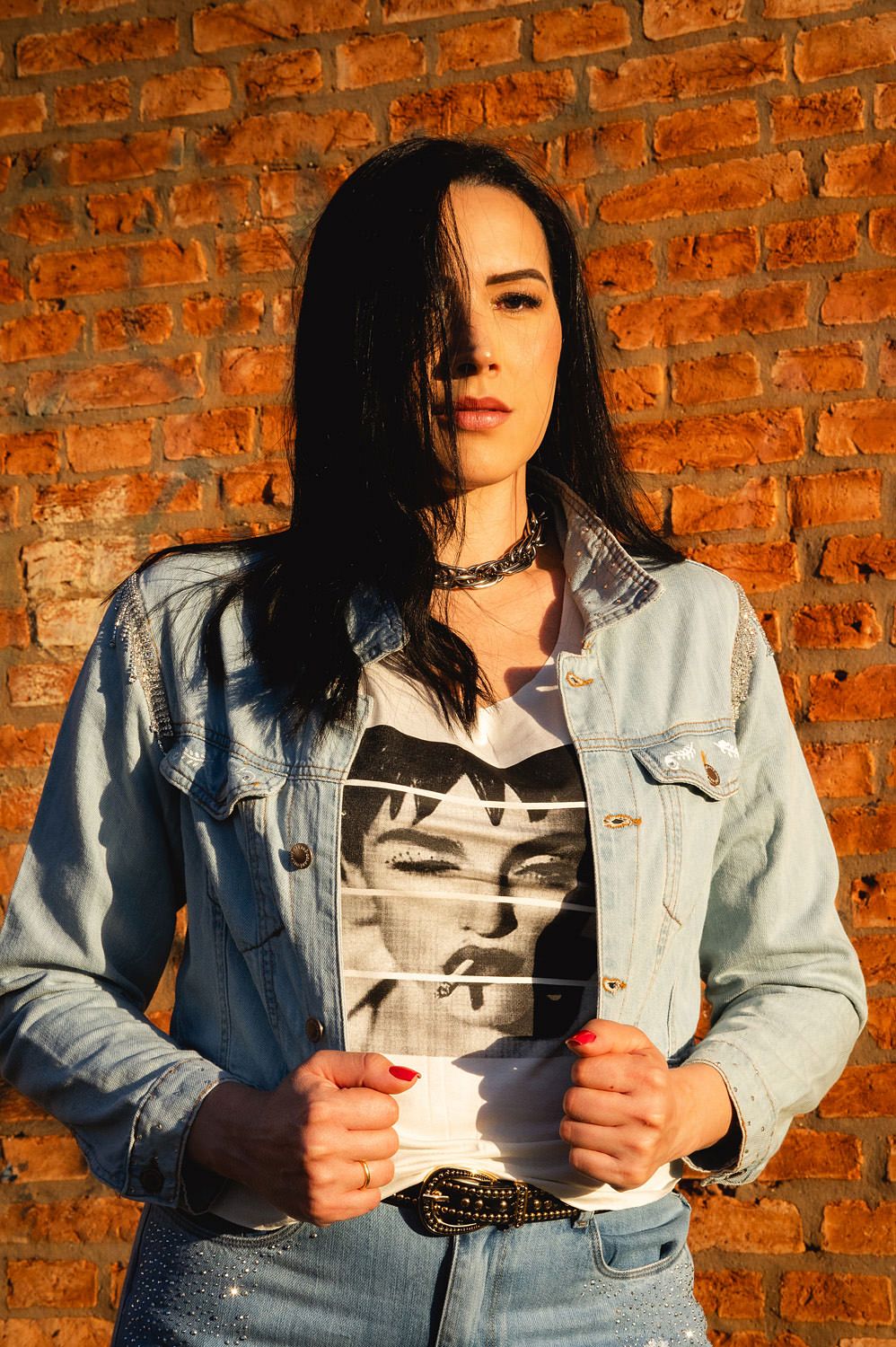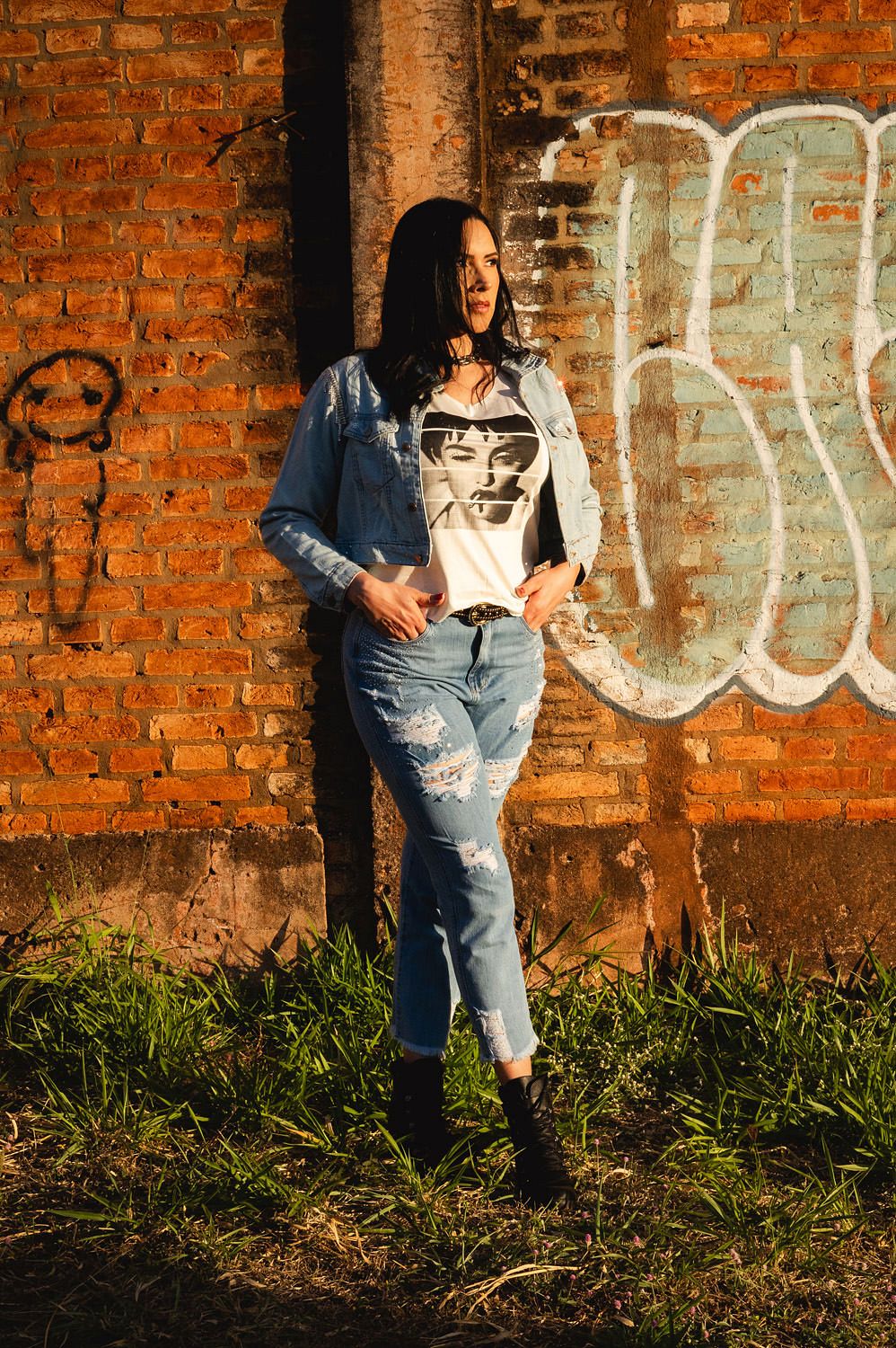 Camiseta em malha estilo cavada baby-long, com as costas abertas e estampa sikl screem.